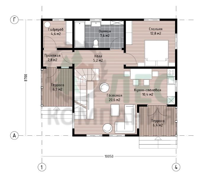 Услуги внутренней и внешней отделки, проведения наружных сетей, благоустройства и др., а так же строительство под ключ; стоимость домокомплекта из бруса других размеров или внесение изменений в проект - оговариваются индивидуально.